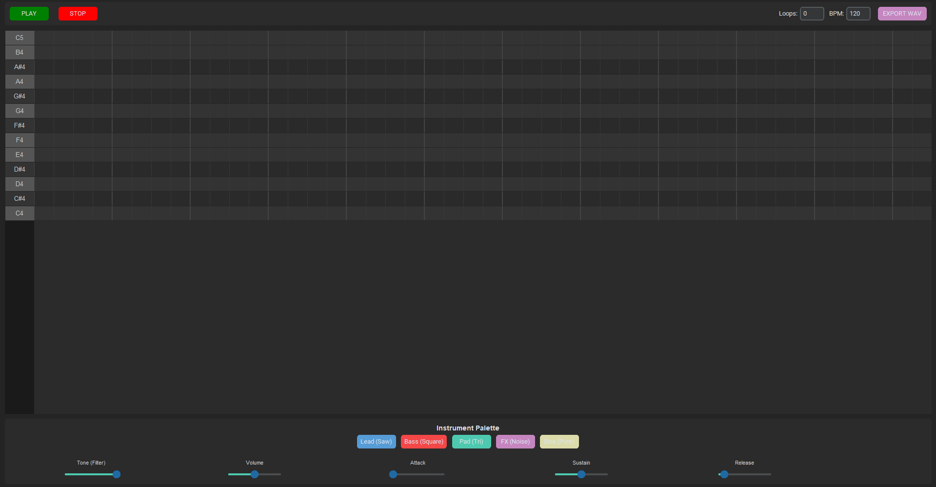 * Sound Design: Sculpt your sound with Tone (Filter), Volume, and ADSR envelopes per instrument.