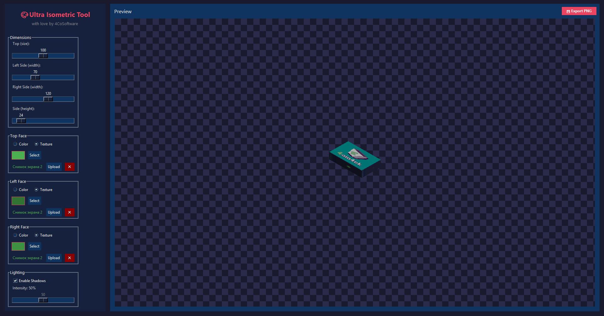 - 🖼️ Texture & Color Support: load your own images onto any face (Top, Left, Right) or use solid colors. Textures are automatically transformed to fit the isometric perspective perfectly.